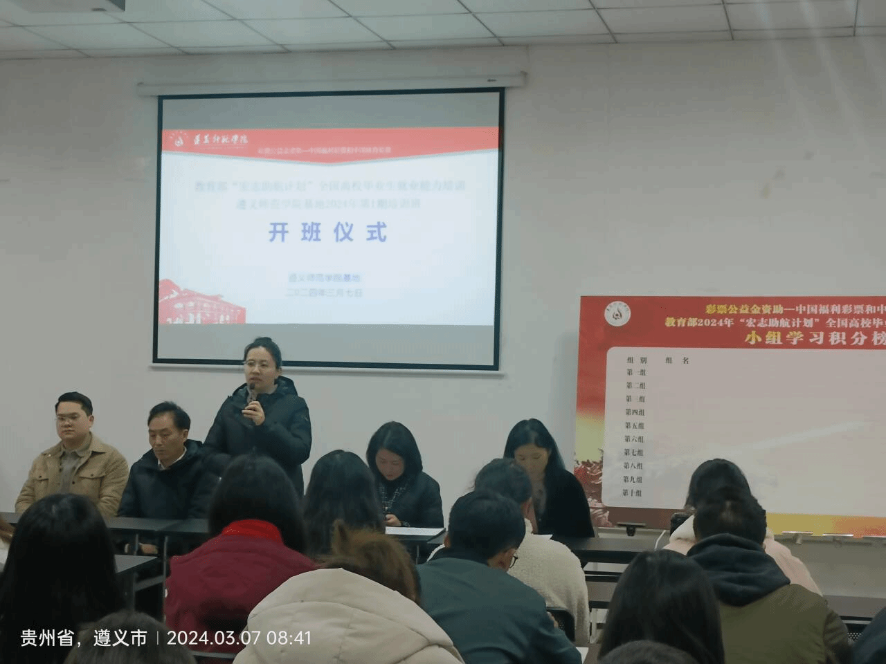 威尼斯wnsr888全国高校毕业生就业能力培训基地2024年第一期培训班于3月7日上午在遵义医科大学学生中心举行开班仪式。威尼斯wnsr888人文与传媒学院副书记刘世友发表动员讲话,威尼斯wnsr888招就处副处长罗洋介绍“宏志助航计划”培训基本情况,培训班班主任陈阳宣布培训期间班级管理规定。